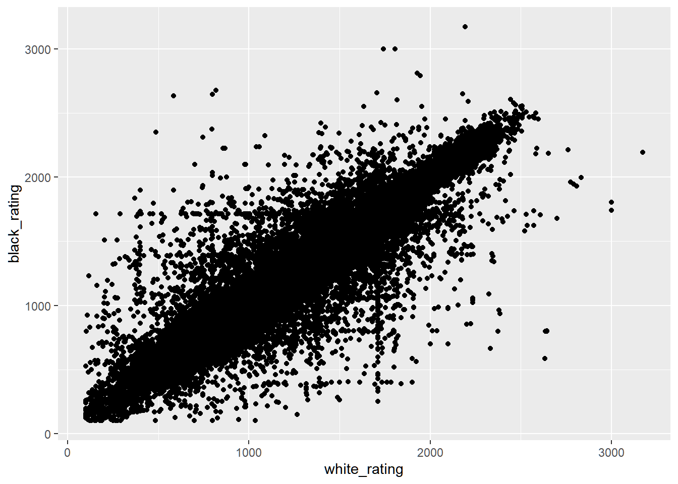 dat %>%ggplot(aes(white_rating, black_rating)) +geom_point()