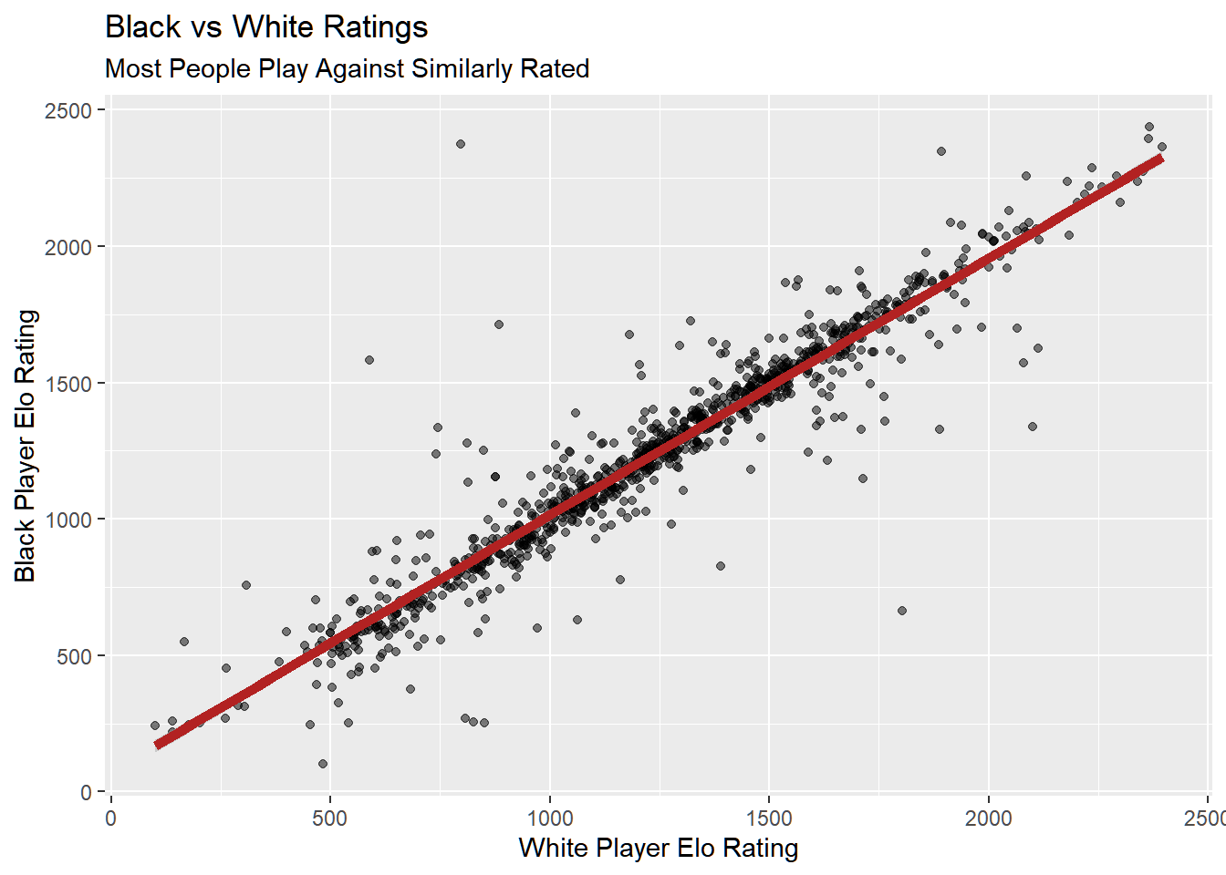 dat %>%sample_n(1000) %>%mutate(average_rating = (white_rating + black_rating) *0.5) %>%ggplot(aes(white_rating, black_rating)) +geom_point(alpha =0.5) +labs(x ="White Player Elo Rating",y ="Black Player Elo Rating",title ="Black vs White Ratings",subtitle ="Most People Play Against Similarly Rated" ) +geom_smooth(method ="lm", se =TRUE, color ="firebrick", linewidth =2)