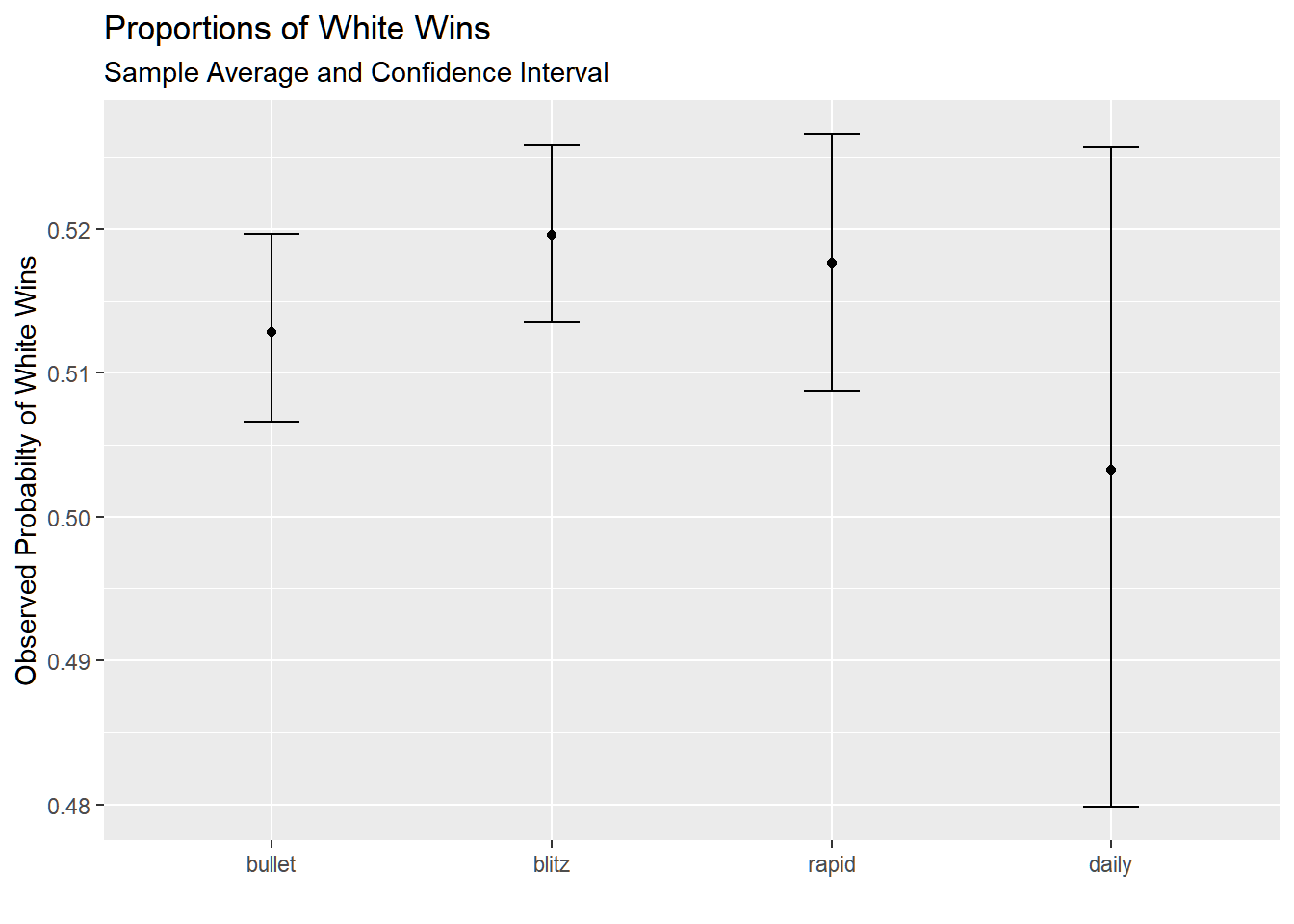 dat %>%mutate(white_win =ifelse(winner =="white", 1, 0)) %>%ggplot(aes(time_class, white_win)) +stat_summary(fun = mean, geom ="point") +stat_summary(fun.data = mean_cl_boot,geom ="errorbar",width =0.2) +theme(legend.position ="top") +labs(x ="", y ="Observed Probabilty of White Wins") +ggtitle("Proportions of White Wins", subtitle ="Sample Average and Confidence Interval ")