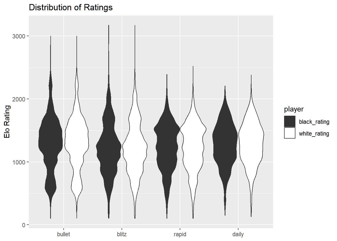 dat %>%pivot_longer(cols =ends_with("rating"),names_to ="player",values_to ="rating" ) %>%ggplot(aes(rating, time_class, fill = player)) +geom_violin() +scale_fill_manual(values =c("#333", "#fff")) +coord_flip() +labs(x ="Elo Rating", title ="Distribution of Ratings") +theme(axis.title.x =element_blank())