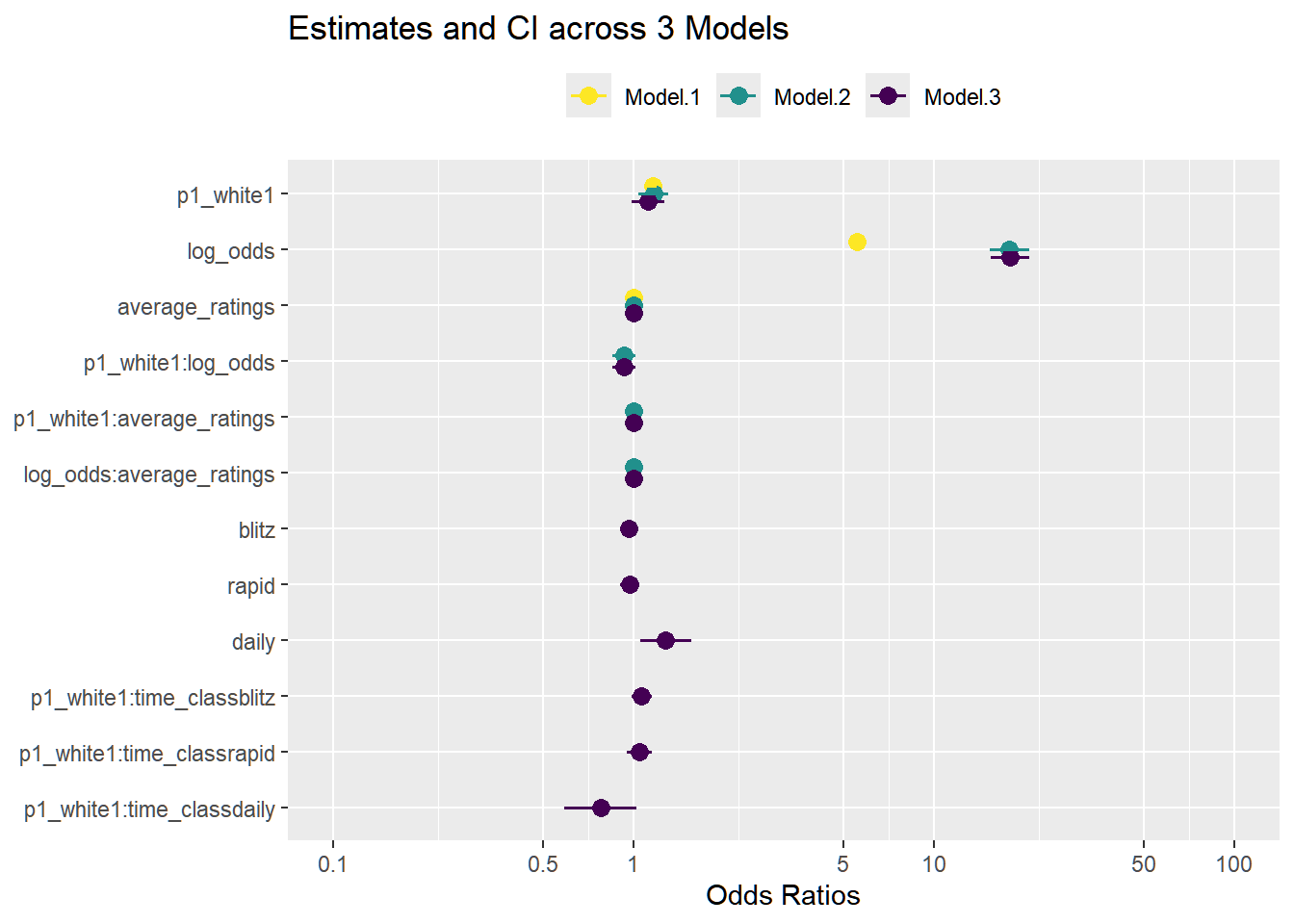 plot_models(mods) +scale_fill_discrete(name ="Model", labels =c("1", "2", "3"))+ggtitle("Estimates and CI across 3 Models") + viridis::scale_color_viridis(discrete = T) +theme(legend.position ="top", legend.title =element_blank())