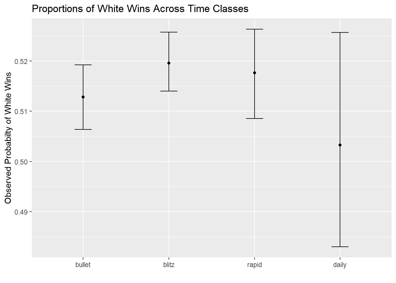dat %>%mutate(white_win =ifelse(winner =="white", 1, 0)) %>%ggplot(aes(time_class, white_win)) +stat_summary(fun = mean, geom ="point") +stat_summary(fun.data = mean_cl_boot,geom ="errorbar",width =0.2) +theme(legend.position ="top") +labs(x ="", y ="Observed Probabilty of White Wins") +ggtitle("Proportions of White Wins Across Time Classes")